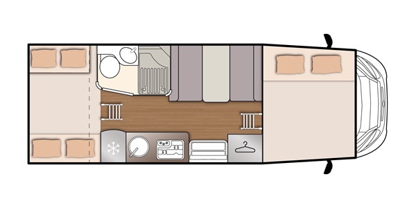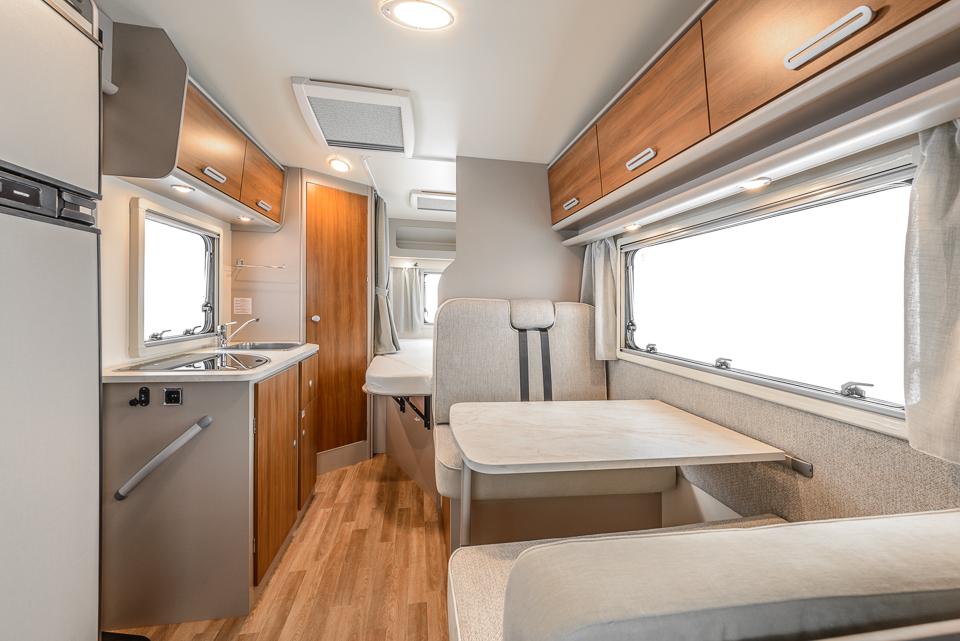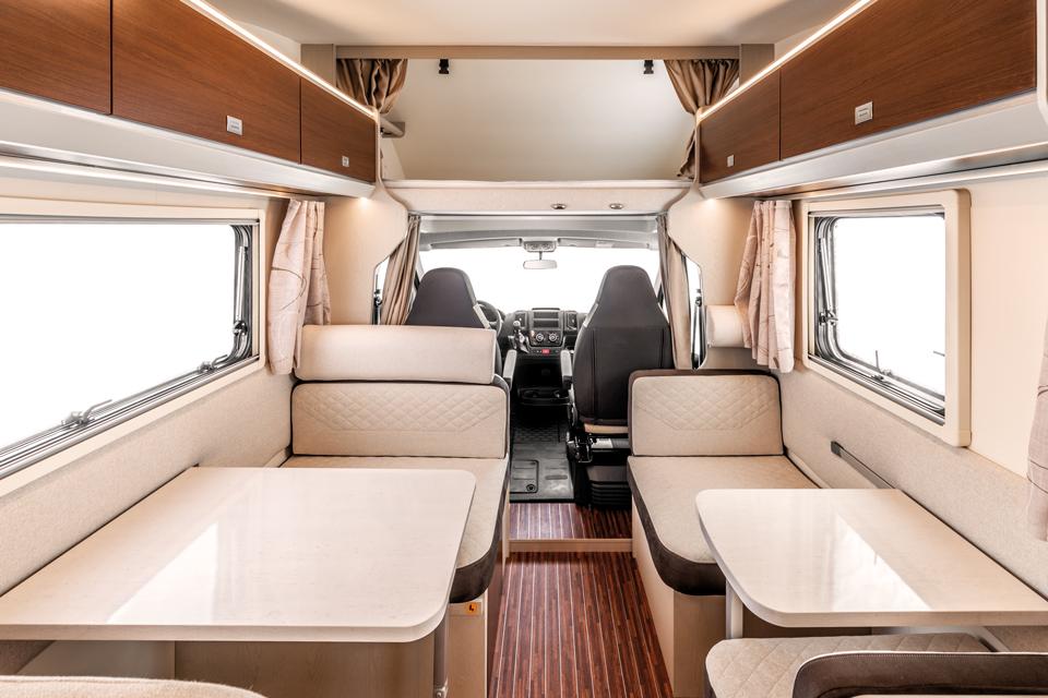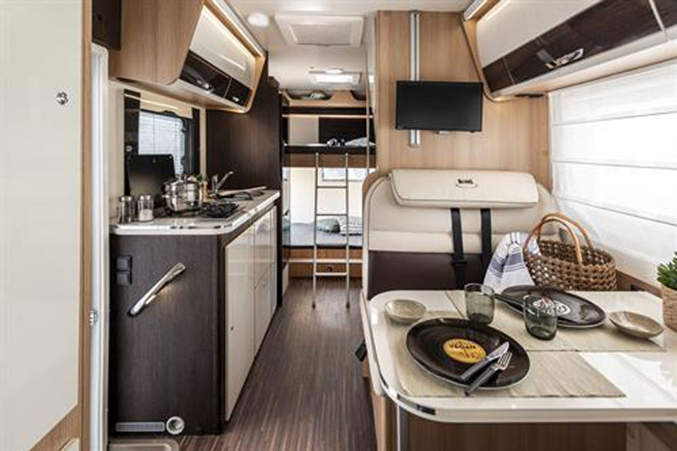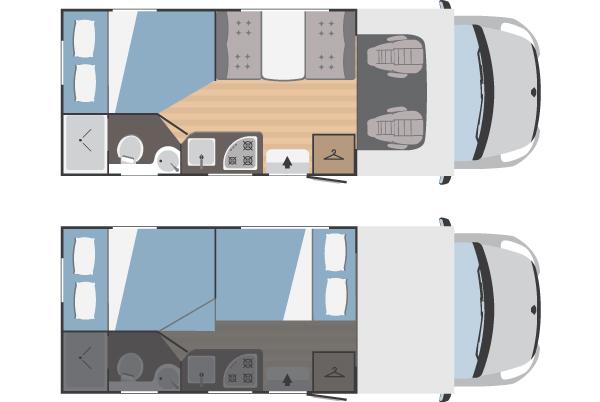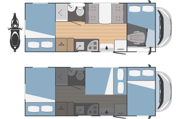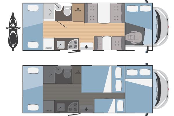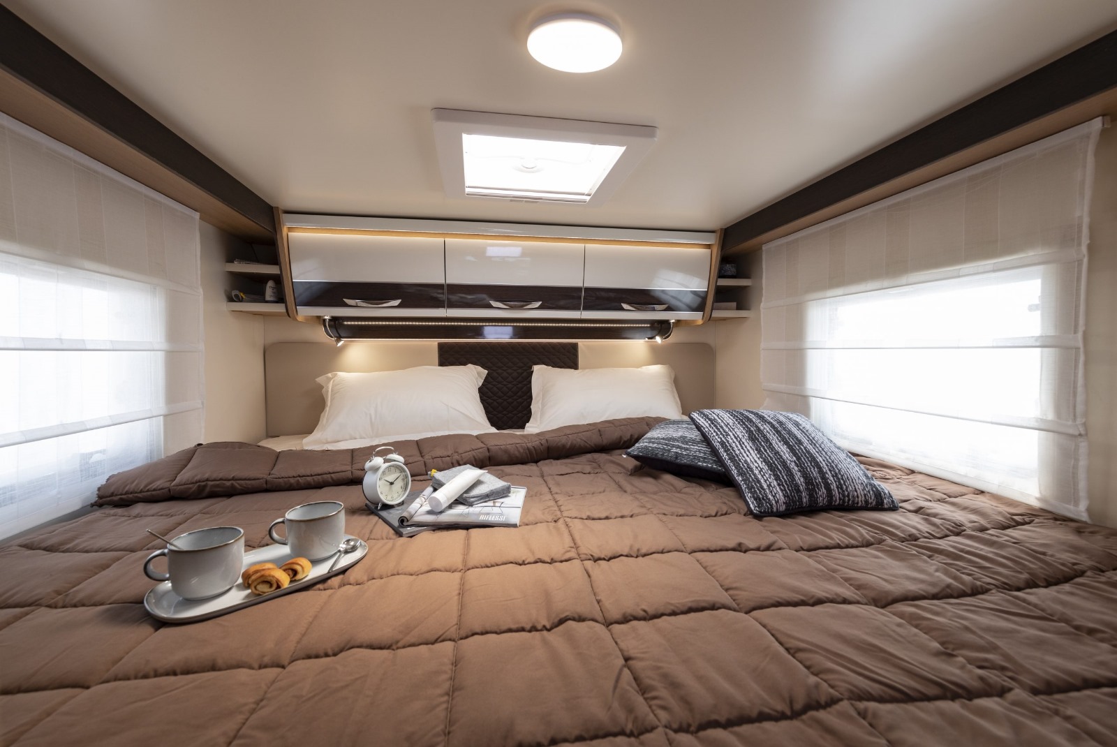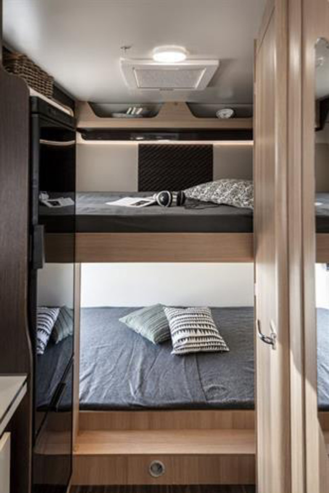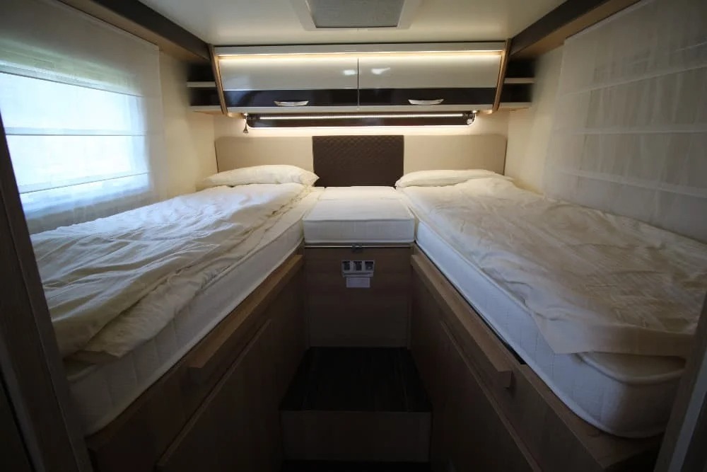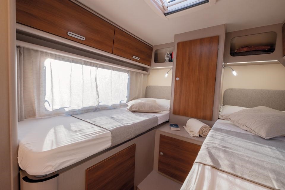 La autocaravana para las familias aventureras, con camas gemelas convertibles en una cama kingsize de 2200 x 1300. Ideal para los niñ@s. Para la aventura perfecta con la mejor comodidad.